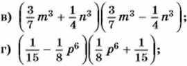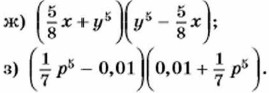 § 13. Разность квадратов. Сумма и разность кубов Умножение разности двух выражений на их сумму (продолжение)857. Представьте в виде многочлена произведение: а) (х2 - 5)(х2 + 5); б) (4 + y2)(y2 - 4); в) (9а - b2)(b2 + 9а); г) (0,7х + y2)(0,7х - у2); д) (10р2 - 0,3q2)(10р2 + 0,Зq2); е) (а3 - b2)(а3 + b2); ж) (с4 + d2)(d2 - с4); з) (5х2 + 2у3) (5х2 - 2у3); и) (1,4с - 0,7р3)(0,7р3 + 1,4с); к) (1,3а5 - 0,1b4)(1,3а5 + 0,1b4). 858. Впишите вместо знака * одночлен так, чтобы получилось тождество: а) (2а + *)(2а - *) = 4а2 - b2; б) (* - 3х)(* + 3х) =16у2 - 9х2; в) (* - b4)(b4 + *) = 121а10 - b8; г) m4 - 225с10 = (m2 - *)(* + m2). 859. Представьте в виде многочлена: