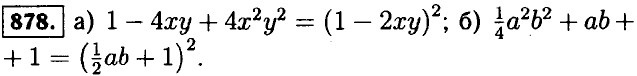 879. а) (а + b)2 - 4аb = а2 + 2аb + b2 - 4аb = a2 - 2ab + b2 = (а - b)2; б) (а - b)2 + 4аb = а2 - 2аb + b2 + 4аb = а2 + 2b + b2 = (а + b)2; в) (х + 3)3 + (х - 3)3 = х3 + 9х2 + 27х + 27 + х3 - 9х2 + 27х - 27 = 2х3 + 54х. 880. а) 2abс2 - 3аb2с + 4а2bс = abc • (2с - 3b + 4а); б) 12а2ху3 - 6аху5 = 6аху3 • (2а - у2); в) -15аm3n4 - 20аm4n6 = -5аm3n4 • (3 + 4mn2); г) -28b4с5у + 16b5с6у8 = -4b4с5у • (7 - 4bсу7).