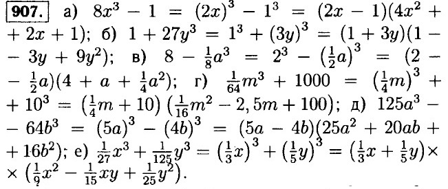 909. a) x3 - у6 = (x - y2)(x2 + xy2 + у4); б) a6 + b3 = (a2 + b)(a4 - a2b + b2); в) m9 - n3 - (m3 - n)(m6 + m3n + n2); г) p3 + k9 = (p + k3)(p2 - pk3 + k6); д) a6 + b9 = (a2 + b3)(a4 - a2b3 + 66); e) x9 - y9 = (x3 - y3)(x6 + x3у3 + y6). 910. a) c3 + 66 = (c + b2)(c2 - cb2 + 4); 6) a9 - b6 = (a3 - b2)(a6 + a3b2 + b4); в) x6 - 8 = (x2 - 2)(x4 + 2x2 + 4); г) 27 + у9 = (3 + y3)(9 - 3y3 + y6).