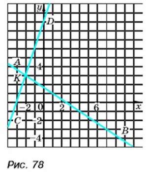 Построим в координатной плоскости графики уравнений системы. Графиком первого уравнения является прямая АВ, а графиком второго — прямая CD (рис. 78).