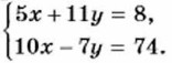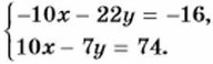 Теперь почленное сложение приводит к уравнению с одной переменной -29у = 58. Из этого уравнения находим, что у = -2. Подставив во второе уравнение вместо у число -2, найдём значение х: 10x - 7 • (-2) = 74, 10x = 60, x = 6. Ответ. x = 6, у = -2. Пример 3. Решим систему уравнении