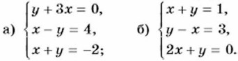 пара чисел: а) а = 0, b = 4; б) а = 0, b = -4; в) а = -4,6 = 0? 1158. Докажите, что прямые х + у = 5, 2х - у = 16 и х + 2у = 3 пересекаются в одной точке. Каковы координаты этой точки? 1159. При каком значении а прямые 5х - 2у = 3 и х + у = а пересекаются в точке, принадлежащей оси у? 1160. При каком значении Ь прямые bх + 3у = 10 и х - 2у = 4 пересекаются в точке, принадлежащей оси х? 1161. При каком значении k прямая у = kх - 4 проходит через точку пересечения прямых у = 2х - 5 и у = -х + 1? 1162. Решите графически систему уравнений: