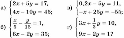 1164. (Для работы в парах.) Подберите какое-либо линейное уравнение с двумя переменными, которое вместе с уравнением 10х + Ьу = 1 составило бы систему: а) имеющую одно решение; б) имеющую бесконечно много решений; в) не имеющую решений. 1) Выполните совместно задание а) и решите составленную систему. 2) Распределите, кто выполняет задание б), а кто — задание в), и выполните их. 3) Проверьте друг у друга правильность выполнения заданий и исправьте ошибки, если они допущены. 1165. Укажите какое-либо значение ?, при котором система