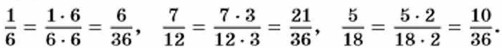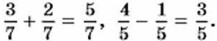 9. При сложении дробей с одинаковыми знаменателями к числителю первой дроби прибавляют числитель второй дроби и оставляют тот же знаменатель. При вычитании дробей с одинаковыми знаменателями из числителя первой дроби вычитают числитель второй дроби и оставляют тот же знаменатель. Например,