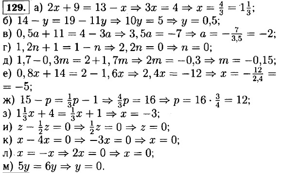 131. а) (у + 4) - (у - 1) = 6y ⇒ у + 4 - у + 1 = 6у ⇒ 6у = 5 ⇒ 132. а) (13x - 15) - (9 + 6x) = -3x ⇒ 13х - 15 - 9 - 6x + 3х = 0 ⇒ 10x = 24 ⇒ х = 2,4; б) 12 - (4x - 18) = (36 + 4x) + (18 - 6x) ⇒ 12 - 4х + 18 = 36 + 4х + 18 - 6х ⇒ 4х - 6х + 4х = 18 + 12 - 36 - 18 ⇒ 2х = -24 ⇒ х = -12. в) 1,6х - (х - 2,8) = (0,2х + 1,5) - 0,7 ⇒ 1,6х - х +2,8 = 0,2х + 1,5 - 0,7 ⇒ 1,6х - х - 0,2х = 1,5 - 0,7 - 2,8 ⇒ 0,4х = -2 ⇒ х = г) (0,5х + 1,2) - (3,6 - 4,5х) - (4,8 - 0,3х) + (10,5х + 0,6) ⇒ 0,5х + 1,2 - 3,6 + 4,5х = 4,8 - 0,3х +10,5х + 0,6 ⇒ 10,5х - 0,3х - 4,5х - 0,5х = 1,2 - 3,6 - 4,8 - 0,6 ⇒ 5,2х = -7,8 ⇒ х = 133. а) 5х + (3х - 3) = 6x +11 ⇒ 5х = 3х-3 = 6x + 11. 8х - 6х = 11 + 3 ⇒ 2х = 14. x = 7. б) 3а - (10 + 5а) = 54 ⇒ 3а - 10 - 5а = 54. -2а = 64 ⇒ а = -32. в) (х - 7) - (2х + 9) = -13 ⇒ х - 7 - 2х - 9 = -13. -x - 16 = -13 ⇒ x = -3. <<< К началу Решенния (окончание) >>>