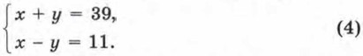 Получили систему двух линейных уравнений с двумя переменными. Можно угадать, чему равны х и у: х = 25, у = 14. Но, во-первых, «метод угадывания» далеко не всегда применим на практике. А во-вторых, где гарантия, что иного решения нет, может быть, мы просто до него не додумались? Можно построить графики уравнений х + у = 39 и х - у = 11, это прямые, причём непараллельные (в отличие от тех, что в примере 1), они пересекаются в одной точке. Эту точку мы уже знаем: (25; 14); значит, это единственная пара чисел, которая нас устраивает, единственное решение системы. О т в е т: 25 и 14.