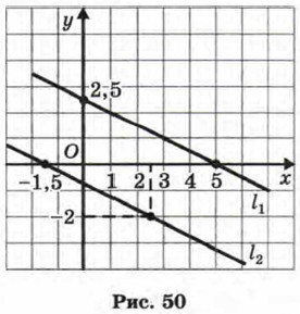 Р е ш е н и е. Графиком уравнения х + 2у - 5 = 0 является прямая. Найдём две пары значений переменных х, у, удовлетворяющих этому уравнению. Если у = 0, то из уравнения х + 2у - 5 = 0 находим х = 5. Если х = 0, то из уравнения х + 2у - 5 = 0 находим у = 2,5. Итак, нашли две точки: (5; 0) и (0; 2,5). Построим на координатной плоскости хОу прямую, проходящую через эти две точки, — прямая l1 на рисунке 50.