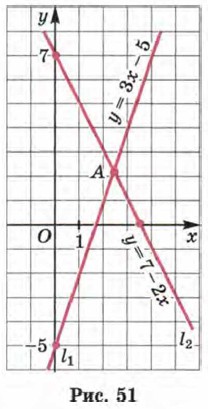 Построим в одной системе координат графики линейных функций у = 3х - 5 (прямая (х на рис. 51) и y = 7 - 2х (прямая 12 на рис. 51). Они пересекаются в точке А, координаты которой — единственное решение заданной системы. А вот чему конкретно равны абсцисса и ордината точки А, мы по рисунку 51 точно определить не сможем (точка А как бы «висит» внутри определённой клеточки). Придётся нам позднее вернуться к этому примеру (см. с. 72—73).