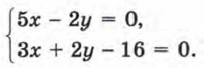 Мы её решили графическим методом в § 7 и знаем, что х = 2,у = 5 — единственное решение этой системы. А теперь решим ту же систему другим способом. Первое уравнение преобразуем к виду 2у = 5х, т. е. у = 2,5x. Второе уравнение преобразуем к виду 2у = 16 - 3х и, далее, у = 8 - 1,5x (все коэффициенты уравнения 2у = 16 - 3х разделили на 2). Теперь систему можно переписать так: