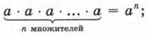 Определение 1. Под аn, где n = 2, 3, 4, 5, понимают произведение п одинаковых множителей, каждым из которых является число а. Выражение аn называют степенью, число а — основанием степени, число n — показателем степени. Подчеркнём ещё раз, что показатель степени — натуральное число (в старших классах мы снимем это ограничение); обычно говорят короче: натуральный показатель. Отсюда и происходит название как всей главы, так и этого параграфа. Итак,