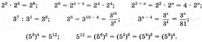 Вопросы для самопроверки 1. Закончите предложение: «При умножении степеней с одинаковыми основаниями показатели ...». 2. Закончите предложение: «При делении степеней с одинаковыми основаниями показатели ...». 3. Закончите предложение: «При возведении степени в степень показатели ...». 4. Запишите каждое из сформулированных вами в п. 1—3 правил на математическом языке. 5. Что получится, если 217 умножить на 213? 6. Что получится, если 217 разделить на 213? 7. Какое из двух равенств верно: (24)3 = 24 + 3 или (24)3 = 24 • 3?