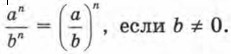 Глава 4. Степень с натуральным показателем и её свойства § 18. Умножение и деление степеней с одинаковыми показателямиВ предыдущем параграфе мы рассматривали умножение и деление степеней с одинаковыми основаниями. Оказывается, можно умножать и делить степени и с разными основаниями, если только показатели у этих степеней одинаковые. Пример 1. Вычислить 24 • 54. Р е ш е н и е. Конечно, можно по таблице из § 16 установить, что 24 = 16 , 54 = 625, а затем умножить 16 на 625. Однако эффективнее следующее рассуждение: 24 • 54 = (2 • 2 • 2 • 2) • (5 • 5 • 5 • 5) = (2 • 5) • (2 • 5) • (2 • 5) • (2 • 5) = (2 • 5)4 = 104 = 10 000. В процессе решения мы получили числовое равенство 24 • 54 = (2 • 5)4. Точно так же можно доказать, что а3b3 = (аb)3. В самом деле, а3b3 = (а • а • а) • (b • b • b) = ab • ab • ab = (ab)3. Вообще имеет место равенство аnbn = (аb)n. Для тех, кому интересно, приведём «молчаливое» доказательство этого утверждения. Попробуйте его «озвучить» и прокомментировать: