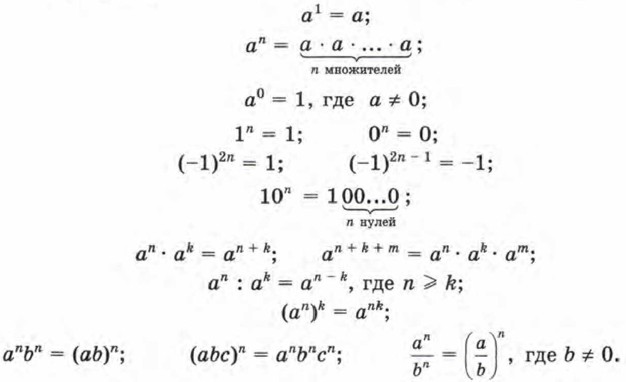 Глава 4. Степень с натуральным показателем и её свойства Степень с натуральным показателем и её свойства. Основные результатыЗдесь собраны основные определения, свойства, теоремы, формулы, правила, которые мы с вами изучали в § 15—19. Всё это записано на сухом математическом языке без всяких комментариев, поскольку комментарии, обоснования были приведены в указанных параграфах.