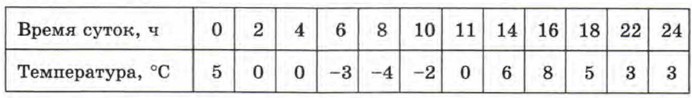 Построенный график есть математическая модель, описывающая зависимость температуры от времени. Анализируя этот график, можно описать словами, что происходило с температурой воздуха в течение суток. Ночью с 0 ч до 8 ч утра становилось всё холоднее (от 5° в 0 ч до -4° в 8 ч утра). Потом, видимо, выглянуло солнышко и стало теплеть, так что в 11 ч температура была уже не отрицательной, а нулевой (0°). До 16 ч теплело, причём в 16 ч было теплее всего (8°). А затем стало темнеть, температура начала постепенно снижаться и понизилась до 3° в 22 ч. Глядя на график температуры, можно приближённо определить, какая была наименьшая температура (-4° в 8 ч утра), какая была наибольшая температура (8° в 16 ч), где температура менялась быстрее, где медленнее, а где вообще не менялась (от 2 до 4 ч ночью и от 22 до 24 ч вечером). Рассмотренная математическая модель является примером графической модели.