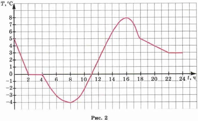 Р е ш е н и е. Построим прямоугольную систему координат. По горизонтальной оси (оси абсцисс) будем откладывать значения времени, а по вертикальной оси (оси ординат) — значения температуры. Построим на координатной плоскости точки, координатами которых являются соответствующие числа из таблицы. Всего получается 12 точек (рис. 1). Соединив их плавной линией, получим один из возможных графиков температуры (рис. 2).