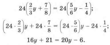 Второй способ. Прежде чем применять алгоритм, умножим обе части уравнения на 24 — это наименьший общий знаменатель имеющихся дробей. При этом мы пользуемся тем, что если А = В, то 24А = 24В, и обратно. Получим