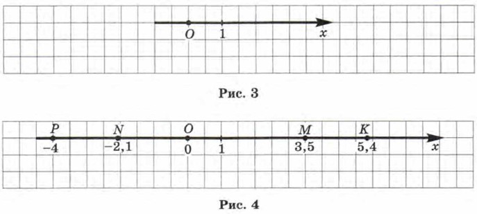 Прямую l, на которой выбрана начальная точка О (начало отсчёта), масштаб (единичный отрезок, т. е. отрезок, длина которого считается равной единице) и положительное направление, называют координатной прямой или координатной осью (рис. 3); употребляют также термин «ось х» («ось у», «ось г» и т. д.). Каждому числу соответствует единственная точка координатной прямой. Например, числу 3,5 соответствует точка М (рис. 4), которая удалена от начала отсчёта, т. е. от точки О, на расстояние, равное 3,5 (в заданном масштабе), и отложена от точки О в заданном (положительном) направлении. Числу -4 соответствует точка Р (см. рис. 4), которая удалена от точки О на расстояние, равное 4, и отложена от точки О в отрицательном направлении, т. е. в направлении, противоположном заданному.