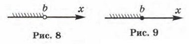 2. Пусть на координатной прямой отмечена точка b. Рассмотрим все точки, которые лежат на прямой левее точки b, и отметим соответствующую часть координатной прямой штриховкой (рис. 8). Это множество точек (чисел) также называют открытым лучом и обозначают (-∞; b), где знак —читается: «минус бесконечность». Оно характеризуется неравенством х < b.