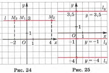 На рисунке 25 изображены прямые, удовлетворяющие уравнениям у = -4 (прямая (l1), у = -1 (прямая l2), у = 3,5 (прямая l3). А какая прямая удовлетворяет уравнению у = 0? Догадались? Ось х.