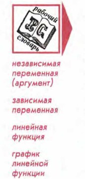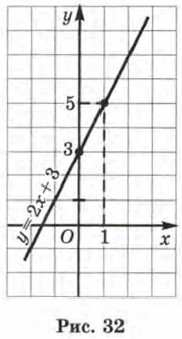 Построим на координатной плоскости хОу точки (0; 3) и (1; 5) и проведём через них прямую. Это и есть график линейной функции у = 2х + 3 (рис. 32). Многие реальные ситуации описываются математическими моделями, представляющими собой линейные функции. Приведём примеры. Первая ситуация. На складе было 500 т угля. Ежедневно стали подвозить по 30 т угля. Сколько угля будет на складе через 2, 4, 10 дней? Если пройдёт х дней, то количество у угля на складе (в тоннах) выразится формулой у = 500 + 30х. Таким образом, линейная функция у = 30х + 500 есть математическая модель ситуации. Теперь нетрудно установить, что: при х = 2 имеем у = 560 (в уравнение у = 30х + 500 подставили х = 2 и получили у — 560); при х = 4 имеем у = 620; при х = 10 имеем у = 800.
