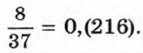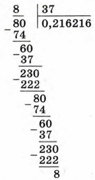Так как при делении числителя 8 на знаменатель 37 последовательно повторяются остатки 8, 6 и 23, то в частном в одном и том же порядке будут повторяться три цифры: 2, 1, 6. Бесконечные десятичные дроби такого вида называют периодическими. Повторяющаяся группа цифр составляет период дроби. При записи периодических десятичных дробей период пишут один раз, заключая его в круглые скобки: