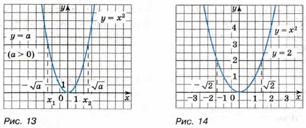 уравнение Уравнение х2 = 2 имеет корни x1 = -√2 и х2 = √2. Эти корни являются иррациональными числами, так как не существует рационального числа, квадрат которого равен 2. С помощью графика функции у = х2 легко найти приближённые значения этих корней: √2 ≈ 1,4 и -√2 ≈ -1,4 (рис. 14). Уравнения х2 =3, х2 = 5, х2 = 6,5 имеют соответственно корни -√3 и √3, -√5 и √5, -√6,5 и √6,5. Эти корни также являются иррациональными числами. Вообще, при любом а ≥ 0 уравнение х2 = а имеет неотрицательный корень √a; иными словами, какое бы число а ≥ 0 мы ни взяли, найдётся неотрицательное число, квадрат которого равен а. Это означает, что