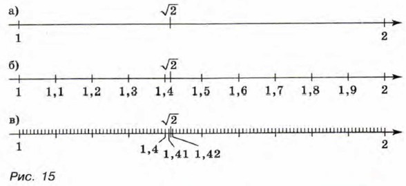 Так как 1,42 меньше 2, а 1,52 больше 2, то число √2 больше 1,4, но меньше 1,5 (рис. 15, б). Значит, √2 = 1,4... . Чтобы найти цифру сотых, будем последовательно возводить в квадрат десятичные дроби 1,41; 1,42; ... . Так как 1,412 = 1,9881, а 1,422 = 2,0164, то число √2 больше 1,41 и меньше 1,42 (рис. 15, в). Значит, √2 = 1,41... . Продолжая этот процесс, найдём, что десятичная запись числа √2 начинается так: 1,414... . Поэтому √2 ≈ 1,414.