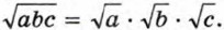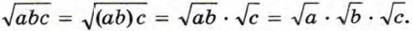 1) √a • √b ≥ 0; 2) (√a • √b)2 = ab. Так как выражения √a и √b принимают лишь неотрицательные значения, то произведение √a • √b неотрицательно. Используя свойство степени произведения, получим (√a • √b)2 = (√a)2 • (√b)2 = ab. Мы показали, что условия 1 и 2 выполняются. Значит, по определению арифметического квадратного корня при любых неотрицательных значениях а и b верно равенство √ab = √a • √b. Доказанная теорема распространяется на случай, когда число множителей под знаком корня больше двух. Например, если а ≥ 0, b ≥ 0, с ≥ 0, то Таким образом, арифметический квадратный корень обладает следующим свойством: