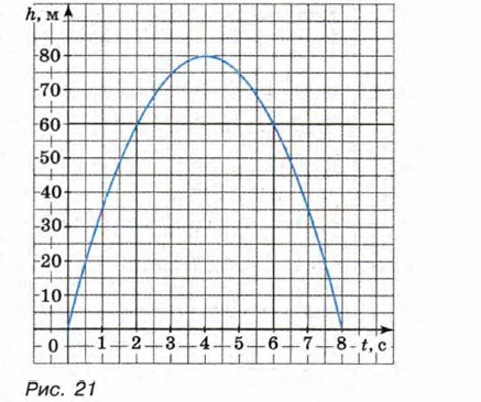Решив полученное квадратное уравнение, найдём, что t1 = 2, t2 = б. На рисунке 21 дан график зависимости h от t, где h = 40t - 5t2. Из графика видно, что тело, брошенное вертикально вверх, в течение первых 4 с поднимается вверх до высоты 80 м, а затем начинает падать. На высоте 60 м от земли оно оказывается дважды: через 2 с и через 6 с после бросания. Условию задачи удовлетворяют оба найденных корня. Значит, ответ на вопрос задачи таков: на высоте 60 м тело окажется через 2 с и через 6 с.