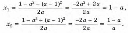 Если а = 0, то данное уравнение обращается в линейное уравнение -х +1 = 0, которое имеет единственный корень х = 1. Пусть а ≠ 0. Тогда мы имеем квадратное уравнение ах2 + (а2 - 1)x - (а - 1)2 = 0. Найдём его дискриминант: D = (а2 - 1)2 - 4а(а - 1)2 = (а - 1)2((а + 1)2 - 4а) = (а - 1)4. Так как D ≥ 0 при любом значении а, то это уравнение при любом а имеет корни. Если а = 1, то D = 0, и это уравнение имеет единственный корень. Найти его можно, подставив в уравнение вместо а число 1. Получим х4 = 0. Отсюда х = 0. Если а ≠ 1, то D > 0, и уравнение имеет два корня: