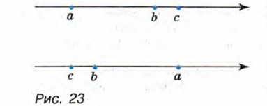 По условию а < b и b < с. Поэтому слагаемые а - b и b - с — отрицательные числа. Значит, и их сумма является отрицательным числом. Следовательно, а < с. Аналогично доказывается, что если а > b и b > с, то а > с. Геометрическая иллюстрация этих свойств дана на рисунке 23.