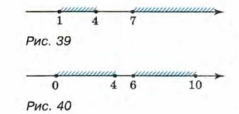 Заметим, что если числовые промежутки не имеют общих элементов, то их пересечением является пустое множество. Например, [1; 4] ∩ [7; +∞) = ∅ (рис. 39). Следует иметь также в виду, что объединение числовых промежутков не всегда представляет собой числовой промежуток. Например, множество [0; 4] ∪ [6; 10] не является числовым промежутком (рис. 40). Упражнения812. Изобразите на координатной прямой промежуток и назовите его: