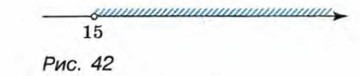 Множество решений неравенства состоит из всех чисел, больших 15. Это множество представляет собой открытый числовой луч (15; +∞), изображённый на рисунке 42. Ответ можно записать в виде числового промежутка (15; +∞) или в виде неравенства х > 15, задающего этот промежуток. Пример 2. Решим неравенство 15х - 23 (х + 1) > 2х + 11.