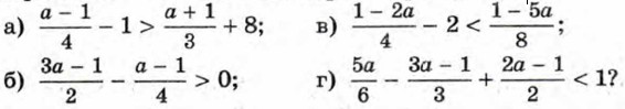 943. Найдите все натуральные числа, удовлетворяющие неравенству: а) 3(5 - 4х) + 2(14 + х) > 0; б) (х + 1)(х - 1) - (х2 - 3х) ≤ 14. 944. При каких значениях х: а) значение дроби 945. Решите неравенство: а) 2(4у - 1) - 5у < 3у + 5; б) 6(1 - у) - 8(3у + 1) + 30у > -5. 946. Найдите, при каких значениях а уравнение имеет положительный корень: