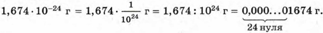 Вернёмся к примеру, рассмотренному в начале пункта. Теперь мы знаем, что запись 1,674 • 10-24 г, выражающая массу атома водорода, означает