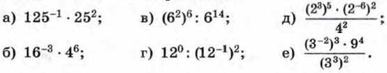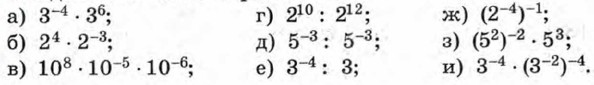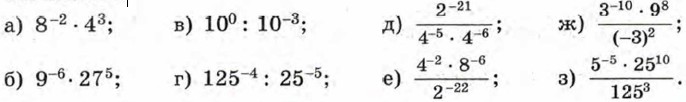990. Представьте выражение в виде степени с основанием 3 и найдите его значение: а) 27 • 3-4; б) (3-1)5 • 812; в) 9-2 : 3-6; г) 813 : (9-2)-3. 991. Представьте выражение в виде степени с основанием 2 и найдите его значение: