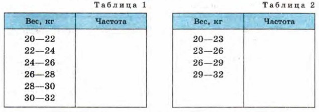 § 13. Элементы статистики Наглядное представление статистической информации: Ответы1055. (Для работы в парах.) В оздоровительном лагере были получены следующие данные (с точностью до 0,1 кг) о весе 30 мальчиков: 21,8, 29,3, 30,2, 20,6, 23,8,