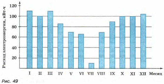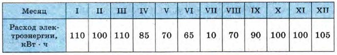 § 13. Элементы статистики Наглядное представление статистической информацииДля наглядного представления данных, полученных в результате статистического исследования, широко используются различные способы их изображения. Одним из хорошо известных вам способов наглядного представления ряда данных является построение столбчатой диаграммы. Столбчатые диаграммы используют тогда, когда хотят проиллюстрировать динамику изменения данных во времени или распределение данных, полученных в результате статистического исследования. В таблице показан расход электроэнергии (с точностью до 5 кВт • ч) некоторой семьёй в течение года.