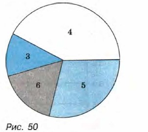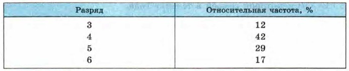 Соответствующая столбчатая диаграмма построена на рисунке 49. Она состоит из 12 прямоугольников, расположенных на одинаковом расстоянии друг от друга. Равные основания прямоугольников выбирают произвольно, а высота каждого из прямоугольников равна (при выбранном масштабе) расходу электроэнергии в указанном месяце. Если в ходе статистического исследования проведена группировка одинаковых данных и для каждой группы указана соответствующая частота (или относительная частота), то каждая группа изображается на столбчатой диаграмме прямоугольником, высота которого при выбранном масштабе равна соответствующей частоте (или относительной частоте). Для наглядного изображения соотношения между частями исследуемой совокупности удобно использовать круговые диаграммы. Если результат статистического исследования представлен в виде таблицы относительных частот, то для построения круговой диаграммы круг разбивается на секторы, центральные углы которых пропорциональны относительным частотам, определённым для каждой группы данных. Построим, например, круговую диаграмму, иллюстрирующую распределение рабочих цеха по тарифным разрядам, представленное в следующей таблице: