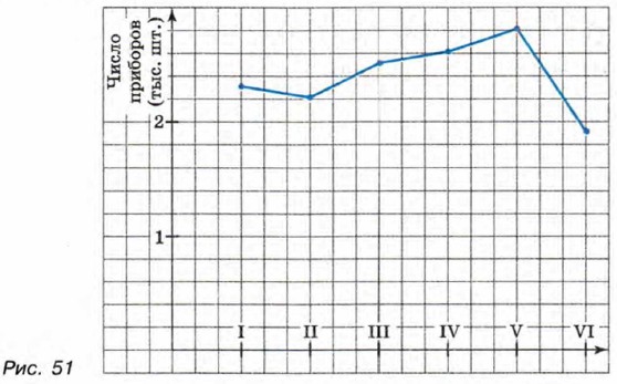 Разбив круг на секторы, получим круговую диаграмму, изображённую на рисунке 50. Заметим, что круговая диаграмма сохраняет свою наглядность и выразительность лишь при небольшом числе частей совокупности. В противном случае её применение малоэффективно. Динамику изменения статистических данных во времени часто иллюстрируют с помощью полигона. Для построения полигона отмечают в координатной плоскости точки, абсциссами которых служат моменты времени, а ординатами — соответствующие им статистические данные. Соединив последовательно эти точки отрезками, получают ломаную, которую называют полигоном. Имеются, например, следующие данные о производстве заводом приборов в первом полугодии 2006 г. (по месяцам):