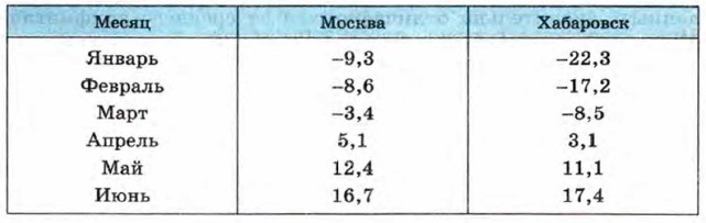 1075. В таблице приведены средние месячные температуры (в градусах Цельсия), установленные для Москвы и Хабаровска для первого полугодия на основе наблюдений, проводившихся в течение 80 лет.