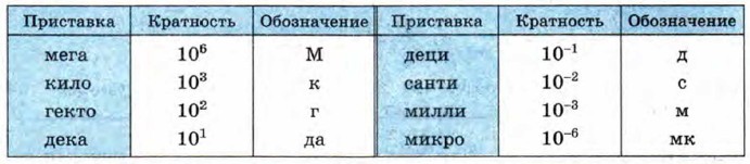 1095. Расстояние от Земли до звезды α Центавра равно 2,07 • 105 астрономическим единицам (астрономической единицей называется расстояние от Земли до Солнца, которое равно 1,495 • 108 км). Выразите это расстояние в километрах. 1096. В 1 ккал содержится 4,2 • 103 Дж. Сколько килокалорий в 1 Дж? 1097. В таблице даны обозначения кратных и дольных приставок и соответствующие им множители.