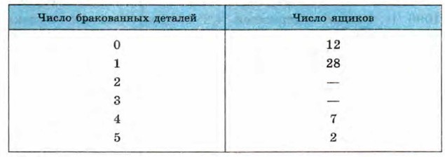 Восстановите его, зная, что в среднем члены артели изготовили по 14,2 изделия. 1101. Проведя учёт бракованных деталей в контрольной партии ящиков, составили таблицу, в которой два числа оказались стёртыми.
