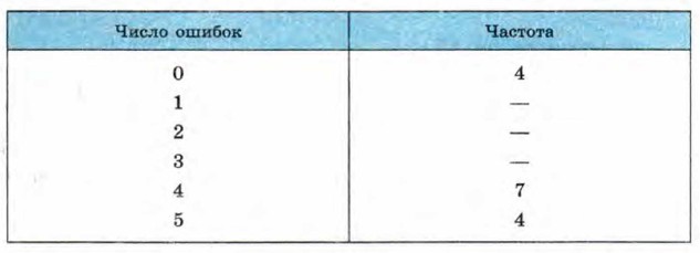 Восстановите их, зная, что ящиков с двумя бракованными деталями оказалось вдвое больше, чем ящиков с тремя бракованными деталями, а в среднем в каждом ящике было по 1,85 бракованной детали. Для рассматриваемого ряда данных укажите моду. Чему равен размах этого ряда данных? 1102. Проведя подсчёт числа орфографических ошибок, допущенных учащимися, составили таблицу частот, в которой три числа оказались стёртыми.