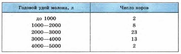 Восстановите их, зная, что среднее из этих чисел на 4 больше предыдущего и на 3 меньше последующего, а в среднем учащиеся допустили по 2,5 ошибки. Для рассматриваемого ряда данных укажите моду. Чему равен размах этого ряда данных? 1103. По данным таблицы распределения призывников по росту, представленной в упражнении 1053, составьте новую таблицу с интервалом в 10 см. 1104. Имеются следующие данные о годовых удоях молока на молочной ферме: