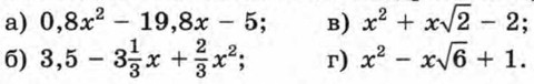 215. Составьте какой-нибудь квадратный трехчлен, корнями которого являются числа: а) -7 и 2; б) 3 - √2 и 3 + √2. 216. При каком значении р выражение 2рх2 - 2х - 2р - 3 становится квадратным трехчленом, одним из корней которого является число нуль? Найдите другой корень. 217. Докажите, что квадратный трехчлен имеет корни, и найдите их сумму и произведение: