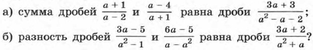 Решив полученное квадратное уравнение, найдем, что у = 6 или у = - 16. Уравнение х2 + х = 6 имеет два корня: -3 и 2. Уравнение х2 + х = -16 корней не имеет. Каждое из чисел -3 и 2 не обращает в нуль знаменатели дробей исходного уравнения и, следовательно, является его корнем. Ответ: -3, 2. Упражнения288. При каких значениях а равно нулю значение дроби: