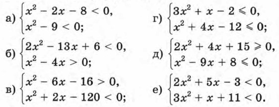 310. При каких значениях b уравнение имеет два корня: а) 3x2 + bх + 3 = 0; б) х2 + 2bх + 15 = 0? 311. При каких значениях t уравнение не имеет корней: а) 2х2 + tx + 18 = 0; б) 4х2 + 4tx + 9 = 0? 312. Найдите множество решений неравенства: а) 3х2 + 40x + 10 < -х2 + 11х + 3;
