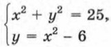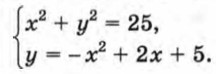 Построим в одной системе координат графики уравнений х2 + у2 = 25 и у = -х2 + 2х + 5 (рис. 65). Координаты любой точки окружности являются решением уравнения х2 + у2 = 25, а координаты любой точки параболы — решением уравнения у = -х2 + 2х + 5. Значит, координаты любой точки пересечения окружности и параболы удовлетворяют как первому уравнению системы, так и второму, т. е. являются решением рассматриваемой системы. Используя рисунок, находим приближенные значения координат точек пересечения графиков: А(-2,2; -4,5), В(0; 5), С(2,2; 4,5), D(4; -3). Следовательно, система уравнений имеет четыре решения: