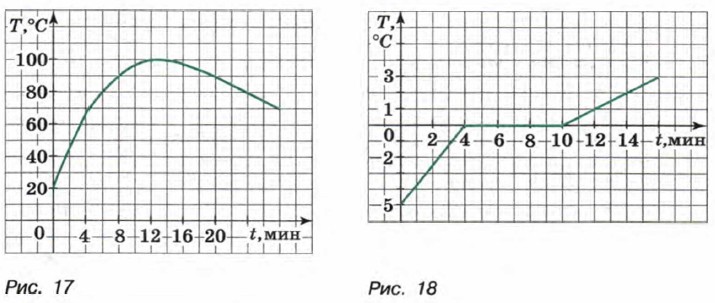 33. На рисунке 17 изображен график температуры воды в сосуде. Опишите, как изменялась температура, и укажите промежуток времени, в течение которого проводилось наблюдение. Каково было наибольшее значение температуры? 34. Некоторый кусок льда, имеющий температуру -5 °С, нагревали на газовой горелке. Результат нагревания в течение 16 мин показан на графике (рис. 18). Какой физический смысл имеет рассматриваемый процесс в каждом из промежутков [0; 4], (4; 10), [10; 16]?